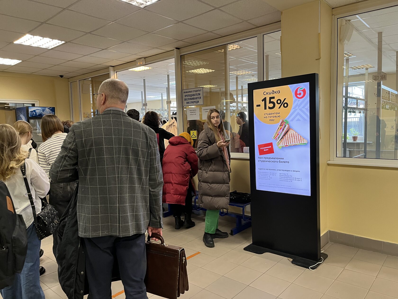 Сеть магазинов «Пятерочка» предоставляет скидку 15% на весь ассортимент готовой еды при предъявлении студенческого билета. Рекламная кампания бренда была запущена MMG в высших учебных заведениях страны в марте 2023 года