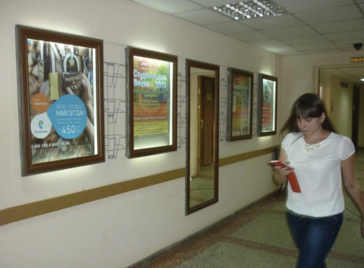 Размещение рекламных постеров осуществлено в наиболее проходимых зонах учебных заведений – холлы, входы в главный учебный корпус, столовые. В рекламной кампании задействованы световые носители.