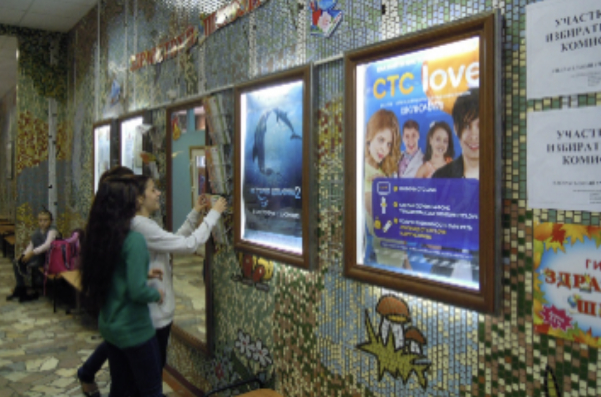 Размещаемый формат рекламного постера - А1, на конструкциях световой INFOboard. Расположение рекламных конструкций в холлах, напротив входа.