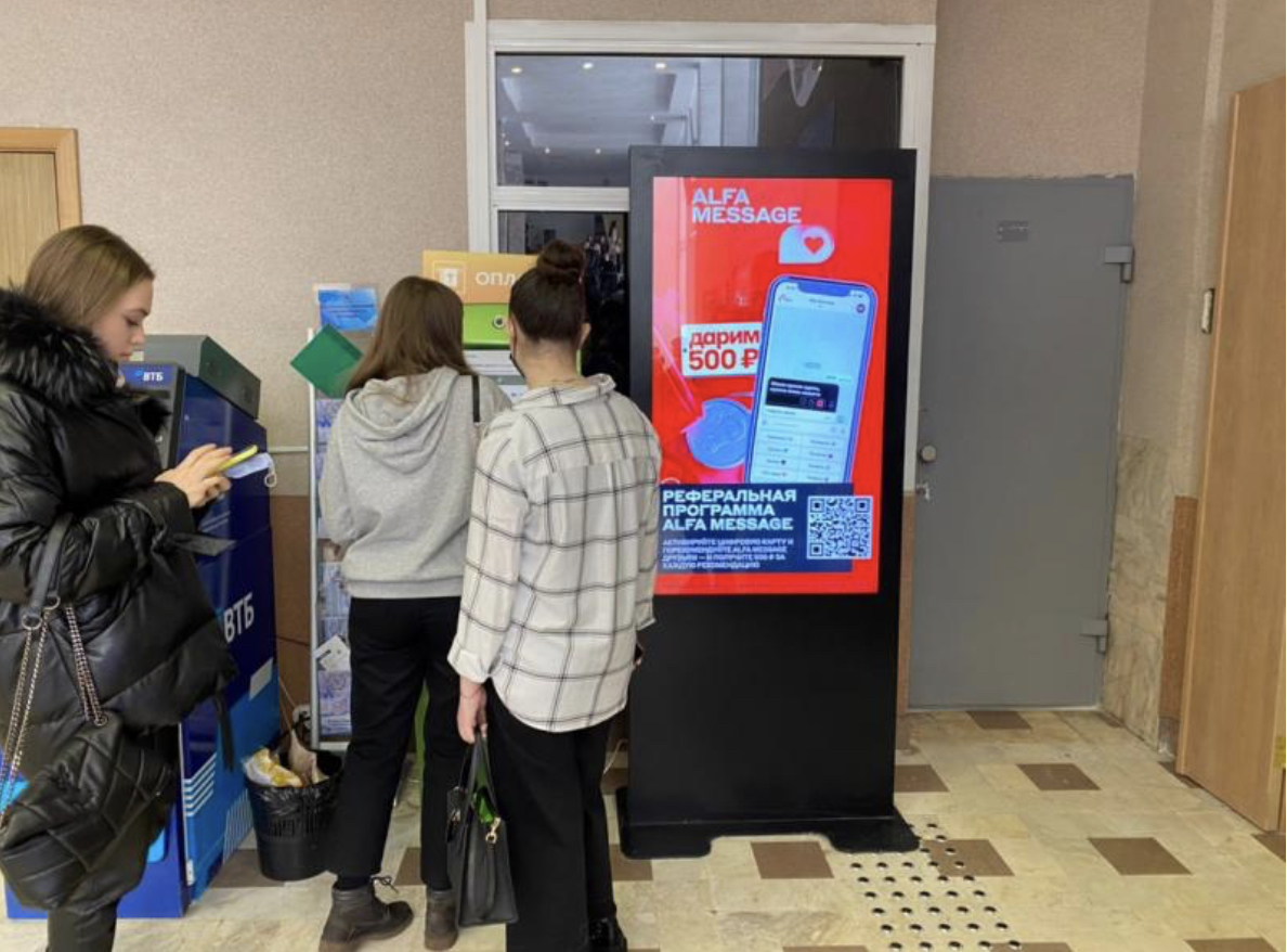 Быстро, удобно, безопасно - все, что так необходимо современному молодому человеку. Дополнительно каждый может получить в подарок 500 рублей при рекомендации Alfa Message своему другу. Распространение рекламного сообщения с различными QR-кодами проводилось на digital-панелях в высших учебных заведениях.