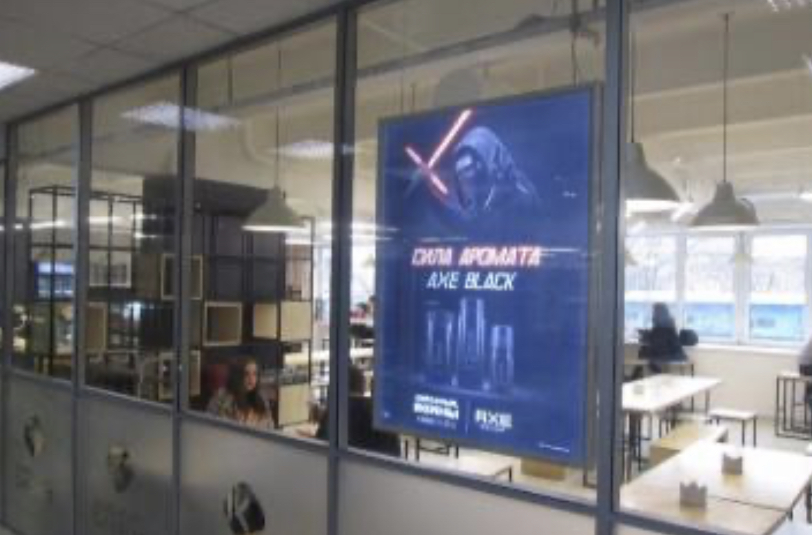 В первой половине декабря 2015 года по заказу агентства Initiative в indoor-сети MaxMediaGroup в учебных заведениях проходит рекламная кампания, поддерживающая выход новой линейки Axe Star Wars компании Unilever. Выход новой линейки продуктов бренда мужской косметики приурочен к премьере седьмой части саги «Звёздные войны», которая состоится в России 17 декабря.