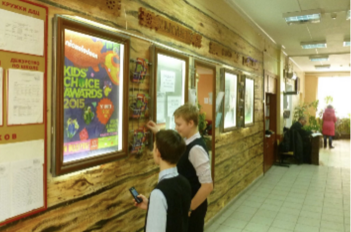 Раздаточные материалы размещены в специальных карманах конструкции световой infoboard. В адресной программе задействованы столичные школы и школы в крупнейших российских городах.